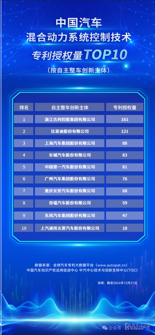 据了解,在混动技术领域,吉利长期保持行业领先地位。据运促中心发布的《2024年度中国汽车混合动力系统控制技术创新企业榜》显示,吉利混合动力系统控制技术专利授权量达161件,综合专利创新指数145.69,技术创新综合得分90分,三项核心指标均位列全行业第一。